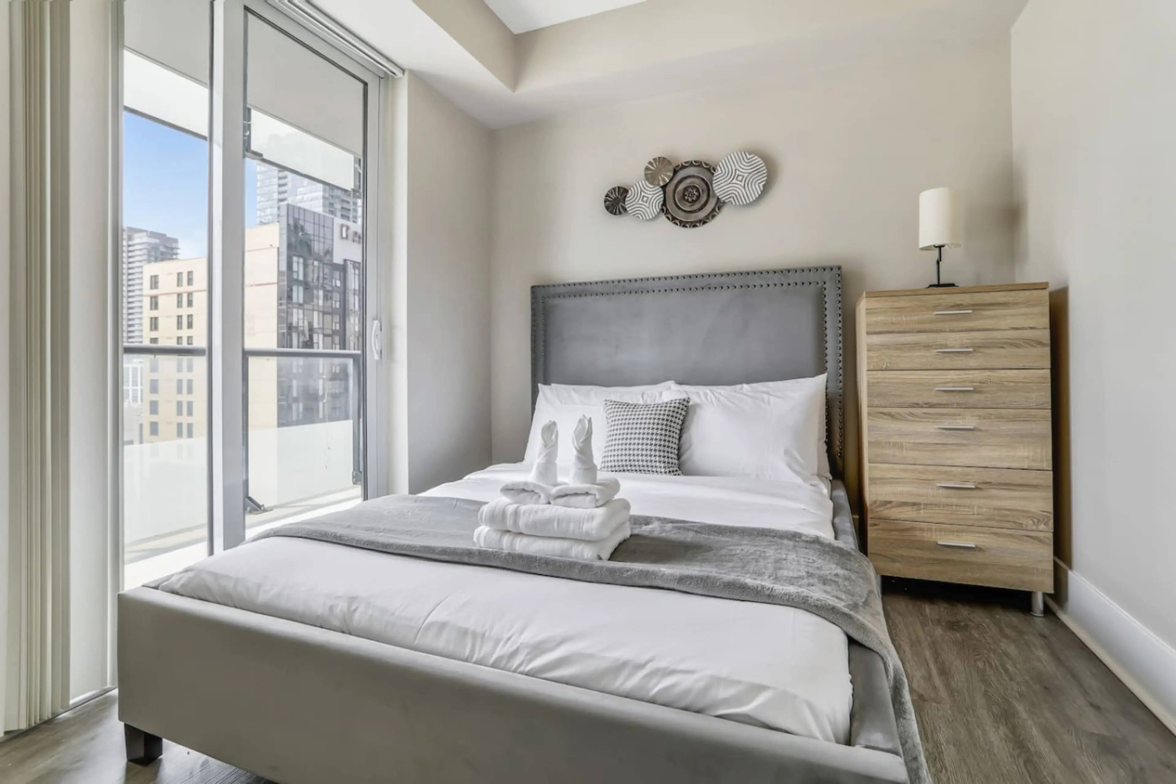 3bed 2bath in Prime Downtown Location - 300 Front St W! Corner suite with balcony, high floor with views! Fully equipped kitchen, in-unit laundry. Smart TV with high-speed 1gb fibre internet. Queen bed in primary and second bedrooms, 2 twins in 3rd bedroom. Workspace with desk & chair. Amazing fitn...